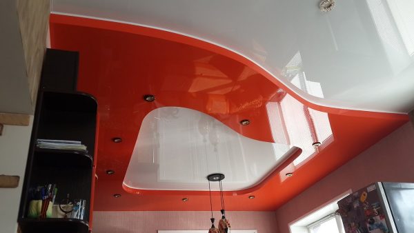 Натяжной потолок белый глянец эффектнее смотрится в центральной части двухуровневой конструкции. Создаётся впечатление присутствия этажа сверху.