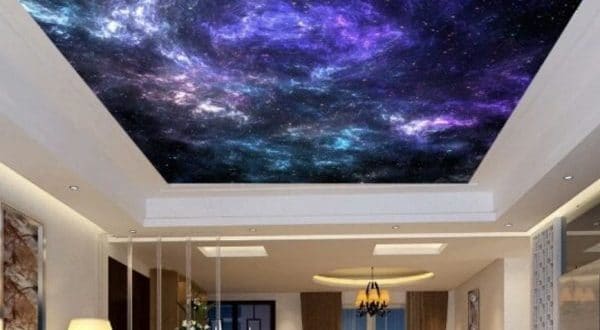 Кроме того, визуально увеличится восприятие пространства помещения. Чёрный или тёмно-синий оттенок наиболее подчеркнёт бездонность и глубину, особенно если изображение будет размещено не на цельном полотне, а в виде вставки в многоуровневой конструкции. К тому же этот вариант станет доступнее и дешевле.