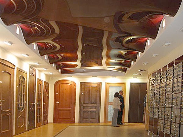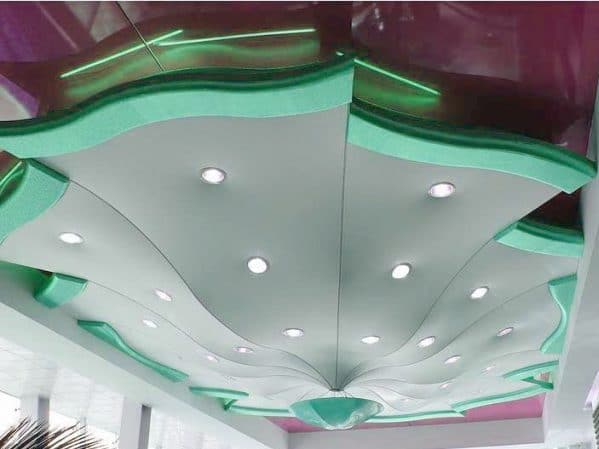 Часто волнистую поверхность можно увидеть в залах с бассейнами. Блики от отражающейся на глянце воды мелькают по всему помещению, а форма полотна способствует гашению звуковых колебаний.