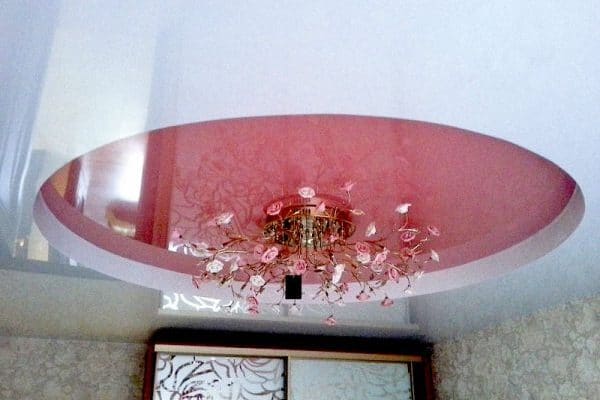 Очень эффектно выглядит применение полотен, отличающихся по цвету или фактуре, на разных ярусах. Идеальное сочетание – глянцевая отделка во внутренней части овала и матовый материал, используемый для оформления остального пространства внутри фигуры.