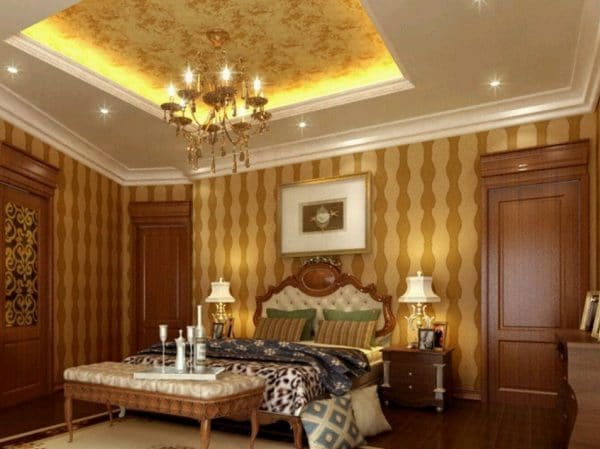 Такой совмещенный потолок отлично будет смотреться с подсветкой, он прекрасно подойдет для спальни и гостиной. Осветительные приборы наиболее часто размещают вдоль линии перехода материалов. Этот способ замечательно подойдет для тех, кто хочет разделить пространство на зоны.